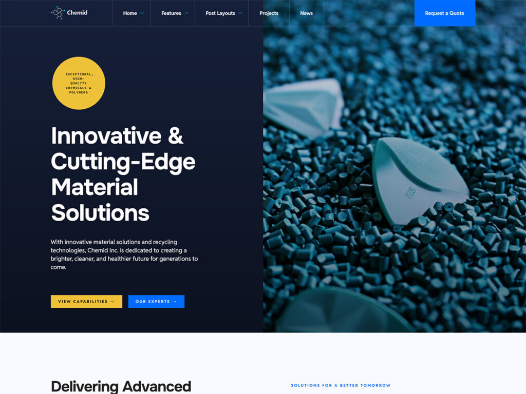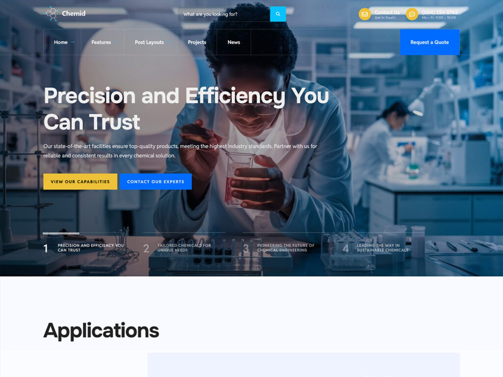 Chemid theme brings modular flexibility. With pre-made blocks can be layout created fast and easily.